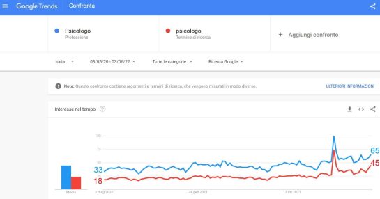 E a causa dei tempi che stiamo vivendo, tra pandemie, guerre ed incertezze economiche, il trend è in continua crescita (nell'immagine i dati di Google, che evidenziano l'aumento delle ricerche attinenti il termine 'psicologo' negli ultimi due anni - con il picco massimo in occasione dell'inizio della guerra in Ucraina).
